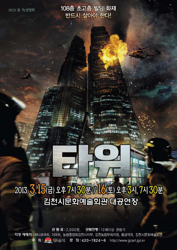 영화「타워」의 관람료는 2,000원으로, 3. 15(금) 오후7시30분, 16(토) 오후3시, 7시30분에 각각 상영하며, 지정예매처(하나로마트, 이마트, 농협김천시지부, 김천농협부곡지점, 황금약국)와 문화예술회관에서 예매중이다. 문의는 김천시문화예술회관(054-420-7824〜6, 홈페이지www.gcart.go.kr)로 하면 된다 |