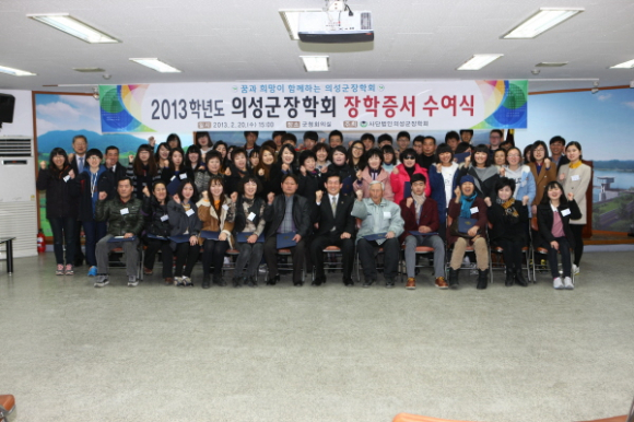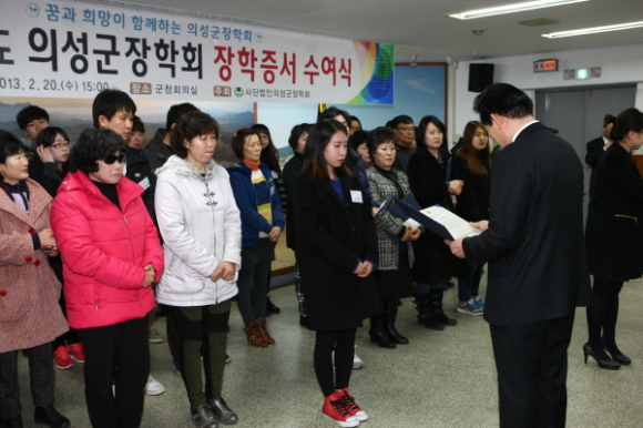 사)의성군장학회는 2월 20일 “2013학년도 장학증서 수여식”을 개최했다.. 이날 수여식에는 김복규 의성군장학회이사장, 장학회 이사, 장학생, 학부모 등 80여명이 참석한 가운에 의성군청회의실에서 열렸다. 이번 장학증서 수여식에서는 명문대(서울대, 연·고대) 진학 5명, 자치단체장 추천 4명, 일반대학생 34명, 고등학생 17명 등 60명에게 1억 4천여만원의 장학금을 전달하였으며, 의성군장학회는 이번 장학금 외에도 이장자녀장학금, 중·고등학생 장학금, 예체능 특기자 장학금, 특별장학금 등 120명에게 8천 2백여만원의 장학금을 추가로 지급할 계획이다. 김복규 이사장은 격려사를 통해 “장학생으로 선발된 학생들이 진취적이고 적극적인 사고로 각 분야에서 최고가 될 수 있도록 노력하고, 오늘을 계기로 나보다 남을 배려하는 마음과 베품의 미덕을 실천하는 훌륭한 사회의 일원으로 성장해 의성발전의 주역이 되어주길 바란다.”고 말했다. 의성군장학회는 지역인재의 발굴과 육성을 목적으로 2002. 12. 24. 설립되어 향토인재양성원 운영, 대구·경북권 대학의 “향토생활관” 입사권을 확보하는 등 다양한 장학사업을 지원해오고 있다.
