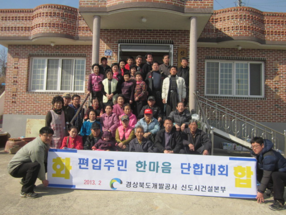 경상북도개발공사 관계자는 '정들었던 고향을 떠나게 되는 이주민들의 애환을 위로, 도청이전신도시 추진사업에 대한 그간의 추진과정과 향후 추진계획 설명, 이주민의 조기이주 당부 및 이주자택지 공급 후 재정착이 조기에 이루어질 수 있도록 행사를 개최하게 되었다'고 말했다. 이 날 산합1리 행사를 시작으로 안동 도양리, 가곡․갈전리, 예천 금능리까지 10개 마을 한마음 단합대회 행사를 3월 초순까지 순차적으로 시행할 계획이라고 설명을 덧붙였다. |
