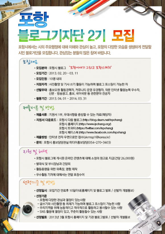 블로그 기자단 신청방법은 포항시 홈페이지(http://www.ipohang.org) 또는 포항시 블로그(http://blog.daum.net/inpohang)에서 지원서를 다운받아 작성 후에 이메일(skrms1@korea.kr)로 제출하면 되며 기타 상세한 사항은 포항시 홍보담당관실 미디어홍보담당 270-3403로 문의하면 된다. |