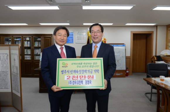 2월 27일 (주)경우크린텍 대표 권영국씨가 영주시인재육성장학회 이사장(김주영)을 방문해 장학금으로 2천만원을 기탁했다. 이날 장학회를 방문한 권영국씨는 “영주시 인재육성장학회가 발전하는데 조그마한 보탬이 되고 싶다”라고 말했다. ㈜경우크린텍은 지난 2011년 2012년에도 장학회에 2천만원의 장학금을 기탁한 바 있다.