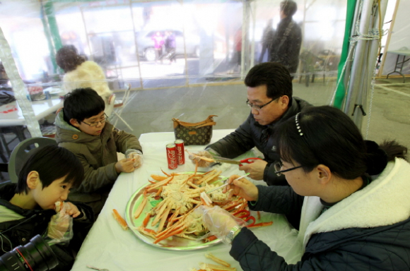 포항시 구룡포에서 지난 2월 16일 열린 ‘제2회 구룡포수산물 한마당잔치’가 개막식 이후로 휴일을 맞아 싱싱한 수산물을 맛보려는 손님들로 북새통을 이루고 있다. 휴일을 맞아 찾은 관광객은 포항 시민들을 비롯해 대다수 대구, 울산, 구미 관광객들로써 3월 1일, 2일, 3일 사흘간 5만명 정도가 구룡포 수산물 한마당 잔치 행사장을 다녀갔다.