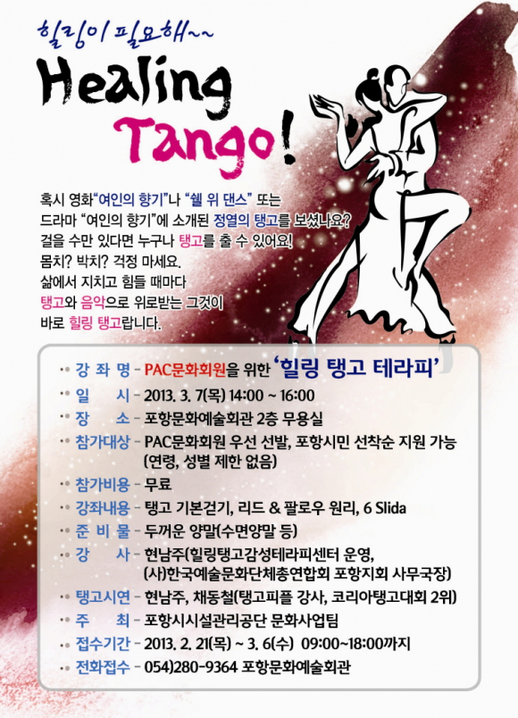 |  | | | ⓒ GBN 경북방송 | | 포항시 시설관리공단에서 주최하는‘힐링 탱고 테라피’ 무료문화강좌가 오는 7일 오후 2시 포항문화예술회관 2층 무용실에서 열린다.