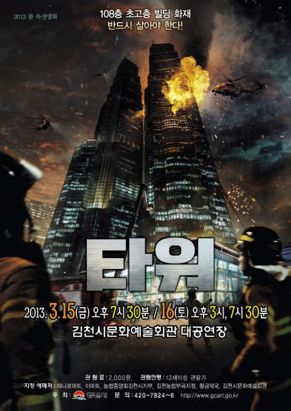 영화 「타워」의 관람료는 2,000원으로, 3. 15(금) 오후7시30분, 16(토) 오후3시, 7시30분에 각각 상영하며, 지정예매처(하나로마트, 이마트, 농협김천시지부, 김천농협부곡지점, 황금약국)와 문화예술회관에서 예매중이다.문의 054)420-7824 〜 6 (http://www.gcart.go.kr) |