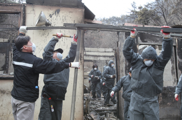 이밖에도 용흥동 산불피해지역에는 새벽부터 굴삭기 6대와 트럭 20대가 투입되어 주택쓰레기, 도로변 쓰레기, 피해목과 시설물 등을 제거해 환경정비와 교통소통을 정상화했다.