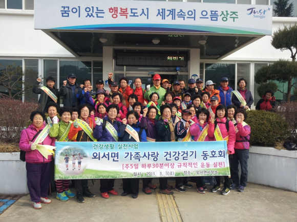 상주시 외서면걷기동호회(회장 김명숙), 면체육회(회장 민병조), 주민 등 80여명은 지난 3월 8일 가족사랑 건강걷기동호회 발대식을 가졌다. 건강걷기는 외서면사무소에서 출발하여 관현리 고붓재 등산로를 지나 관현리 마을회관에서 제공하는 떡국을 먹고, 외서면보건지소에서 해산하는 순으로 진행됐다.