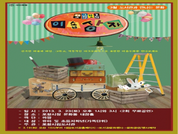 포항시립도서관은 오는 23일 시청 문화동 대잠홀에서 오후 1시와 3시, 두 차례 극단 까망의 ‘보글보글 이솝상자’를 초청했다.