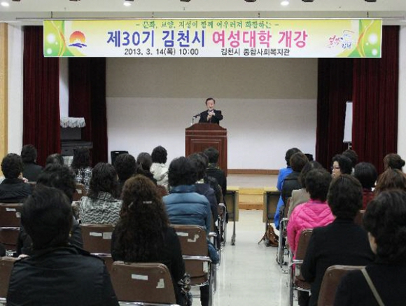 박보생 김천시장, 양숙자 김천시여성대학총동창회장을 비롯한 제30기 김천시여성대학 신입생 100여명이 참석한 가운데 14일 여성회관 3층 강당에서『제30기 김천시 여성대학 개강식』이 열렸다.