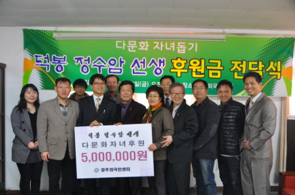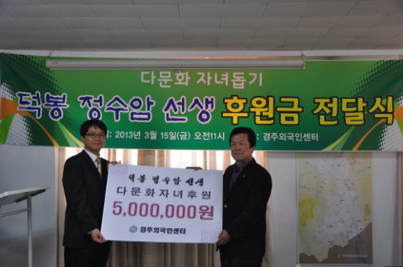 이번 서예전의 수익금 전부를 다문화자녀를 돕기 위해 경주외국인센터에 후원하기로 했으며 3월 15일(금) 경주외국인센터(센터장 윤혁권)에서 후원금 전달식이 있었다.