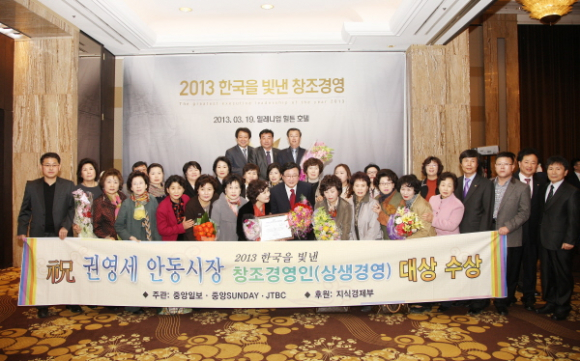 권영세 안동시장이 ‘2013년 한국을 빛낸 창조경영인’에 선정됐다. 안동시는 권 시장이 3월19일 서울 힐튼호텔에서 중앙일보와 중앙SUNDAY, JTBC가 주관하고 지식경제부가 후원한 ‘2013년 한국을 빛낸 창조경영인 상생경영부문’에 선정됐다고 밝혔다.
