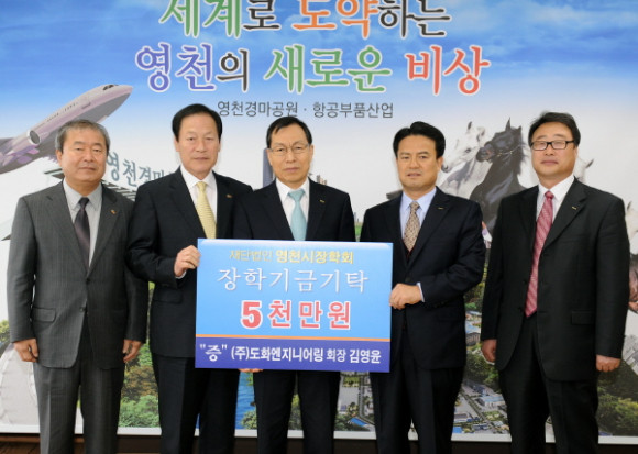 |  | | | ⓒ GBN 경북방송 | | 지난 20일 (주)도화엔지니어링(회장 김영윤)에서 지역우수 인재양성에 사용해 달라고 재)영천시 장학회(이사장 김영석시장)에 장학기금 5천만원을 기탁했다. (주)도화엔지니어링 노진명 사장은 “미래 인재육성은 사회 발전의 밑거름이라고 생각한다. 우리 기업 또한 글로벌 기업으로 성장하기 위해서는 우수한 인재가 절실히 필요한 만큼 미래를 위해서라도 우리 기업인 또한 인재양성에 적극 동참해야한다는 마음에서 장학금을 기탁하게 됐다"며 "이를 계기로 보다 많은 사람들이 장학회에 관심을 갖고 기금 조성에 동참하는 분위기가 조성되길 바란다."고 말했다.