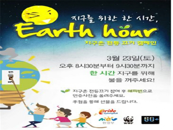 한시간 불끄기로 지구는 숨쉰다. 3월 23일 오후8시30분부터 한시간 동안 소등행사 실시