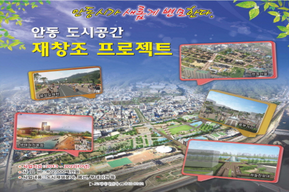 안동시(시장 권영세)는 2014년 경북도청 이전과 2019년 중앙선 복선전철화 사업에 따른 안동역사(驛舍) 이전과 도청신도시 개발로 기존 도심 공동화가 우려됨에 따라 “도시공간 재창조 프로젝트"기본구상 수립을 완료하고 명품도시로 거듭나기 위해 본격추진에 들어간다.