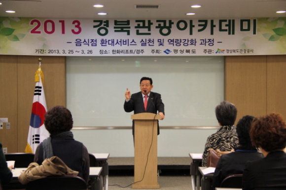 이번 교육은 국내․외 관광객들의 경북방문에 따른 음식점환경개선 환으로 경북도내 우수음식점 종사자들에 대한 친절 마인드 함양과 대서비스 개선 등 관광객 수용태세 확립을 위한 교육으로 마련되었다.