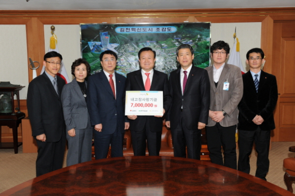 김천시(시장 박보생)와 협약한 한국일보 및 KB카드가 공동으로 주관하는 ‘내고장 김천사랑카드’ 만들기 운동으로 조성된 후원금 700만원을 3월 27일 김천시청 접겹실에서 김천시인재양성재단에 기탁했다.