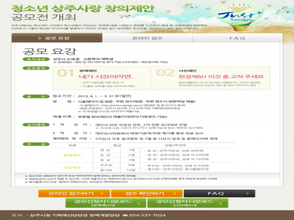 기타 자세한 사항은 공모전사이트 http://www.sangju.go.kr/idea 또는 상주시청 기획예산담당관(☎054-537-7024)로 문의하면 된다.