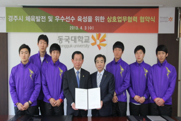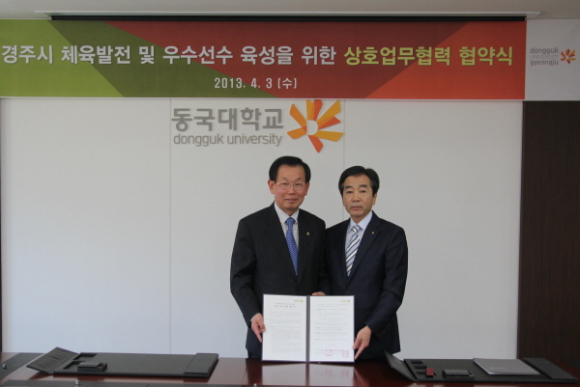 동국대학교 경주캠퍼스(총장 이계영)는 경주시체육회(회장 최양식)와 지난 3일 오전 11시 30분에 교내 100주년 기념관에서 경주시 체육발전 및 우수선수 육성을 위한 상호 업무 협약서를 체결했다.