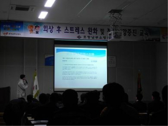 이날 강사로 나선 포항의료원 정신건강의학과 정재욱 전문의는 화재, 구조, 구급 등 소방공무원의 업무수행 중 극한 상황에서 오는 외상 후 스트레스의 원인과 사례, 스트레스에서 오는 재경험, 회피반응, 증가된 각성반응 등을 다뤘다.