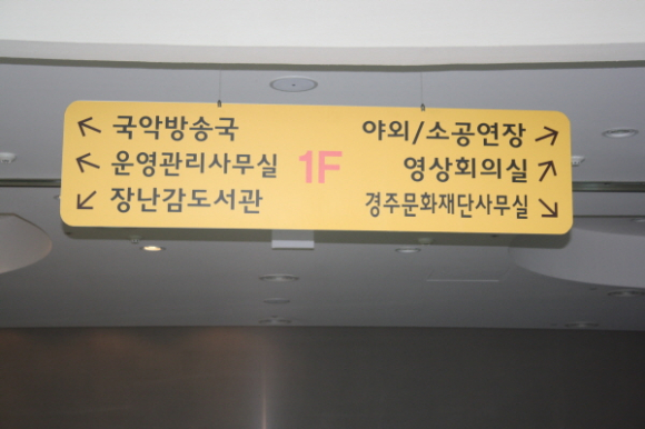 먼저 상징색인 노랑, 검정, 자주를 사용해 건물 안팎의 안내판을 바꿔(사진) 4월 1일 설치를 완료했다. 김아림 전시기획 담당자는 “경주의 상징색으로 경주의 이미지가 통합되는 효과가 나타날 것이다. 향후 전당에 상징색을 다양하게 활용하겠다.”라고 말했다. |