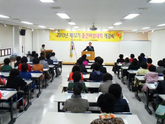 중견여성대학은 저출산 고령화 사회에 대비해 중견여성의 지위향상, 여성들의 적극적인 사회적 참여 및 역할강화를 위해 마련된 평생교육 프로그램이다. 이날 개강식은 여성문화회관 동아리팀 ‘기타랑’의 연주로 시작됐으며, 위덕대 황순이 강사가 ‘중년 여성의 긍적적이고 적극적인 삶의 추구 및 역할 강화를 위한 행복한 인생’이라는 내용의 특강도 진행했다.