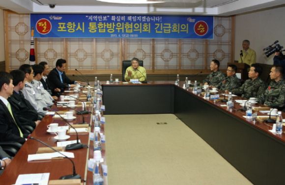 포항시 통합방위협의회는 12일 중회의실에서 박승호 포항시장을 비롯해 이칠구 시의회 의장, 오광환 포항교육장, 전병훈 포항특정경비지역사령관, 이승도 해병대교육훈련단장, 정일태 KBS포항방송국장, 경찰관계관 등 유관기관 통합방위협의회 위원 16명이 참석한 가운데 긴급 통합방위협의회를 개최했다.