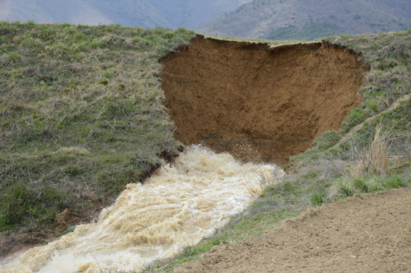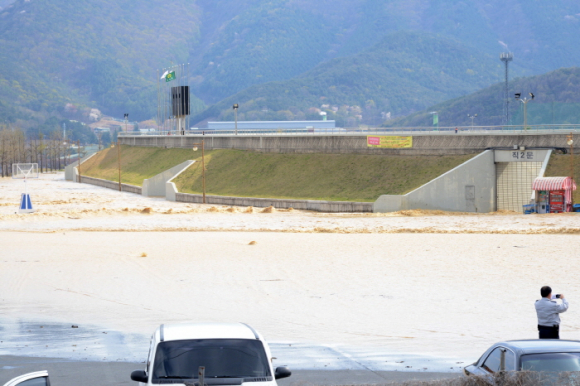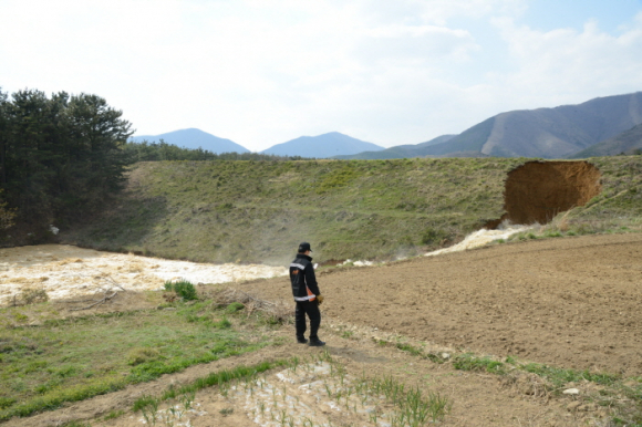 경주 안강읍 산대리 저수지 둑 터져 주민 대피 및 수해