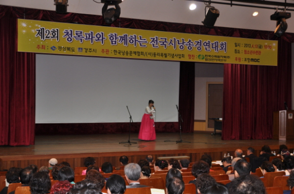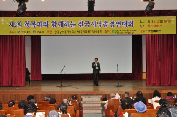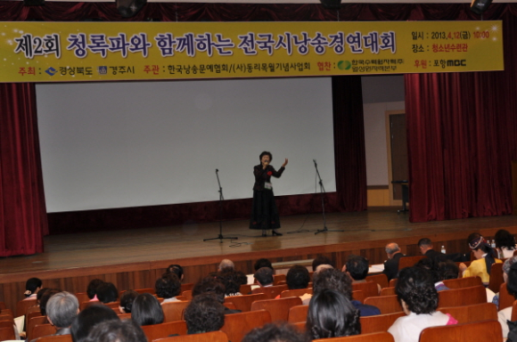 |  | | | ⓒ GBN 경북방송 | | 2013년 4월 12일 10시부터 20시까지 경주 청소년수련관에서 경상북도⋅경주시 주최, (사)동리목월기념사업회⋅한국낭송문예협회 주관, 한수원(주)월성원자력본부 협찬, 포항 MBC 후원인 제2회 청록파와 함께하는 전국시낭송 예선 및 본선대회가 열렸다.