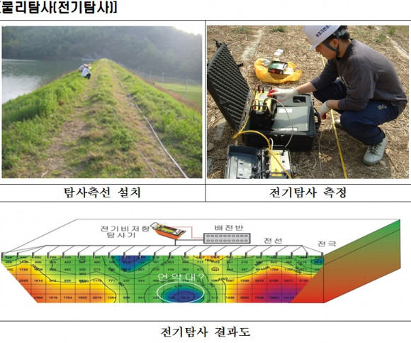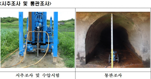 전류를 이용한 「물리탐사」, 누수 의심부분에 대한 「시추조사」, 용수공급을 위해 제방을 관통하는 관수로인 통관의 내부 「TV촬영조사」 등의 기법이 활용됨