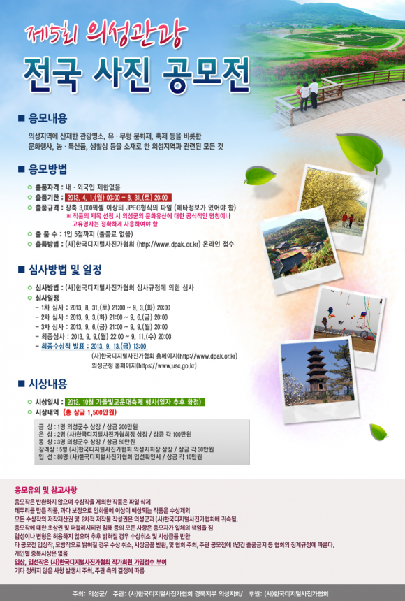 당선작발표는 2013. 9. 13(금) 의성군청 홈페이지 및 한국디지털사진가협회 홈페이지를 통해 공고하며, 공모전 수상자에게는 금상 200만원 등 총1,500만원의 상금이 주어지며 모든 입상, 입선작은 한국디지털사진가협회 작가회원 가입점수가 부여된다.