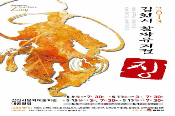 김천시(시장 박보생)는 제51회 경북도민체전 개막작으로 창작뮤지컬「징」을 5월 8일 프리뷰 공연을 시작으로 5월 13일까지(5일 8회) 김천시문화예술회관 대공연장에서 공연한다.