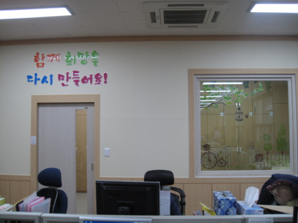 상담실은 민원인의 편의를 위해 사무실 일부를 개조했으며, 복지지원과 직원들의 의견을 반영해 자체적으로 만든 “함께 희망을 다시 만들어요!”라는 슬로건과 어울리게 밝고 안락한 분위기에서 상담이 가능하도록 환하게 꾸며놓았다.