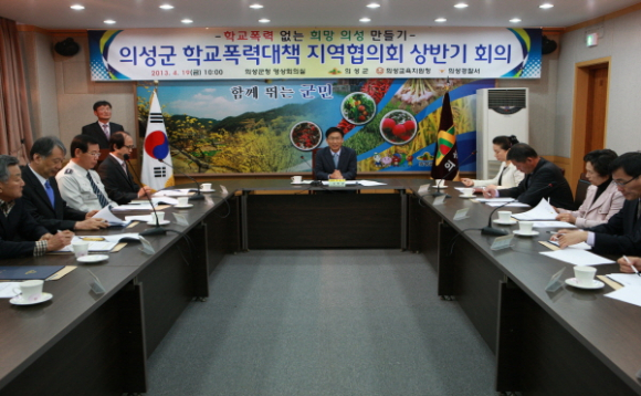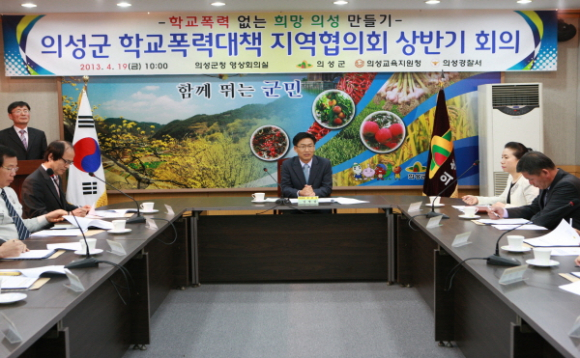 의성군(군수 김복규)은 4월 19일 오전 10시 군청 영상회의실에서 학교폭력은 더 이상 학교만의 문제가 아니라 사회구성원 전체가 나서서 해결해야 할 문제로 인식, 학교폭력근절 지원 대책 및 청소년 유해업소 일제 정화 추진을 위한 2013년도 상반기 의성군 학교폭력대책 지역협의회(위원장 김병삼 부군수)'회의를 개최했다. 학교폭력대책지역협의회는 지난해 5월 관련법령 개정으로 법적 근거를 마련하였으며, 학교폭력의 문제가 이슈화되며 이를 예방 및 체계적인 지원을 위하여 자치단체·교육지원청·경찰서·사회단체 등 각계각층 대표 15명으로 구성되어 유기적인 연계 협력을 통하여 효율적인 학교폭력 대응방안을 모색하기 위해 구성된 협의체다.
