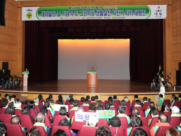 이날 행사는 2011년부터 국가기념일로 지정된 새마을의 날을 기념하고 제51회 경북도민체전 성공개최 기원 및 그린생활자전거 타기 행사가계획되어 있었으나, 행사 당일 아침부터 비와 눈이 내려 김천과학대학교 운동장에서 하려던 행사가 김천문화예술회관 대공연장으로 행사장이 변경되어 자전거타기는 취소하고 기념식과 경품권 추첨을 실시했다.