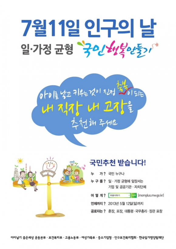 보건복지부는 7월 11일을 국가기념일인 인구의 날로 지정하고 매년 인구복지협회, 아이낳기 좋은세상 운동본부와 함께 일․가정 균형에 앞장서는 우수기관에 정부포상을 실시하고 있으며 국민행복을 제시 했고 아이를 낳고 기르는 것이 진정 축복이 될 때 국민행복 시대가 만들어 질수 있다며 인구정책의 중요성을 강조 했다.