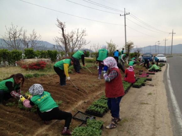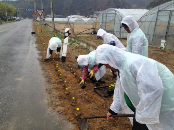 조마면 새마을회 우중에 연도변 꽃심기 작업 완료