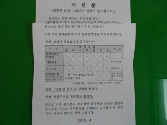 김천시 대곡동「쓰레기배출 안내」서한문 발송
