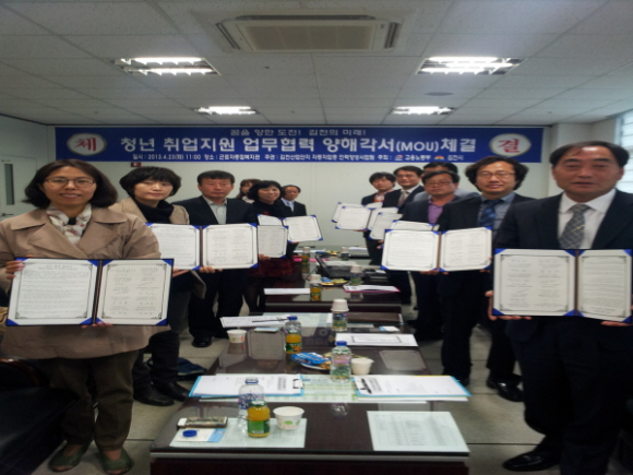 김천시(시장 박보생)는 산업단지 내 자동차업종 인력양성사업의 원활한 추진을 위해 지난 4월 23일 근로자종합복지관에서 구미고용센터, 컨소시엄기관 관계자와 지역내 대학교, 고등학교 취업 관계자들이 참석한 가운데 청년 취업지원에 대한 업무협력 협약을 체결했다.