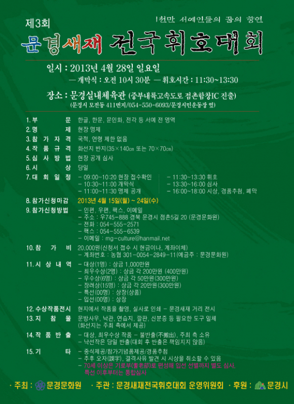 서예인들의 꿈의 향연인 제3회 문경새재 전국휘호대회가 오는 4월 28일 문경실내체육관에서 개최된다.