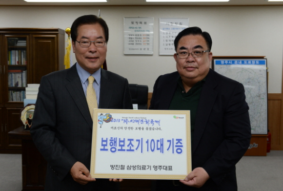 방진철 삼성의료기 영주대표(52세, 영주2동)가 2013 영주선비문화축제를 앞두고 ‘선비의고장’에 맞는 어르신을 위한 보행보조기 10대(300만원 상당)를 기증하여 훈훈한 마음을 전했다.