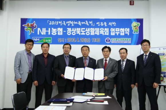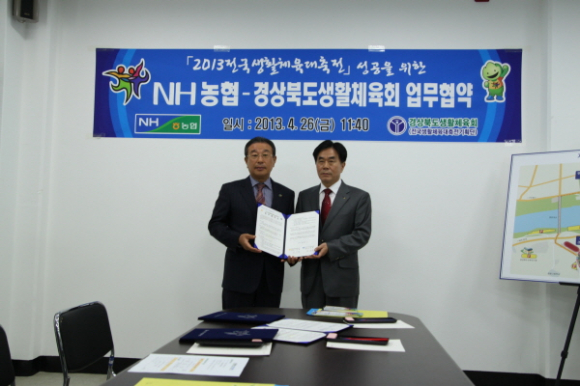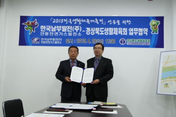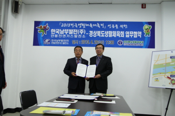 경상북도생활체육회[2013전국생활체육대축전기획단](회장 김성환)와한국남부발전(주)안동천연가스발전소(소장 박세현), 농협은행경북영업본부(부본부장 황청근)은 4월 26일(금) 11:30 2013전국생활체육대축전기획단 사무실(이하 대축전)에서 대축전의 성공개최를 위한 공식협찬 업무협약을 체결한다.