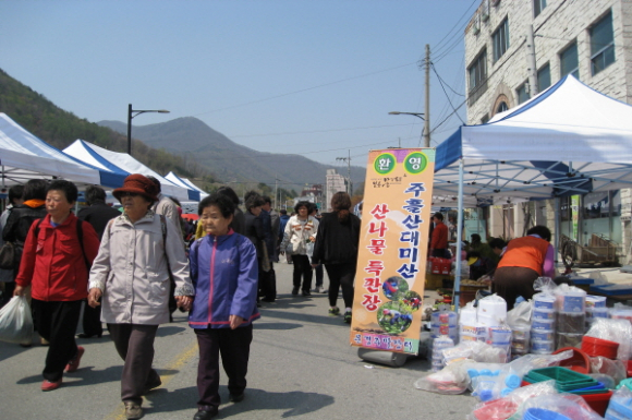 한 문경할머니 장터에는 청정지역 문경의 산과 들에서 직접 채취한 취나물, 두릅, 쑥, 달래, 냉이, 씀바귀 등의 다양한 봄나물도 구입 할 수가 있었고 전통시장의 약돌한우, 약돌돼지, 문경사과, 문경오미자 등도 맛 볼 수가 있었다.
