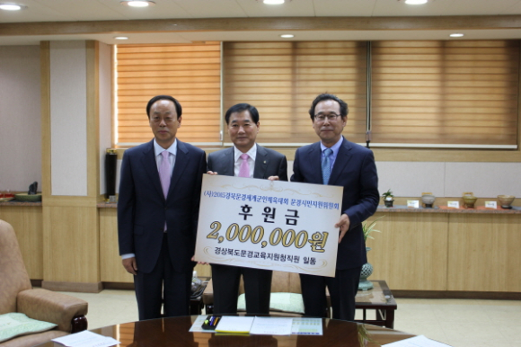 |  | | | ⓒ GBN 경북방송 | | 경상북도문경교육지원청(교육장 현낙길)은 직원들ㅇ리 십,시일반 모은 후원금 200만원을 2015경북문경세계군인체육대회의 성공개최 지원에 써달라며 문경시민지원위원회(위원장 김지훈, 주대중, 현한근)에 전달했다.