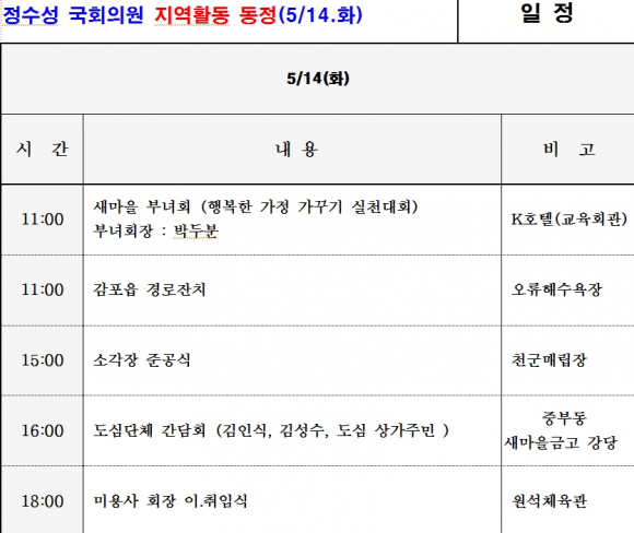 정수성 국회의원 지역활동 동정(5/14.화)