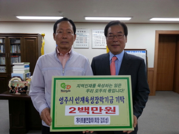 5월 21일 영주시 게이트볼연합회(회장 김도성)는 영주시인재육성장학회를 방문하여 2백만원을 기탁했다.