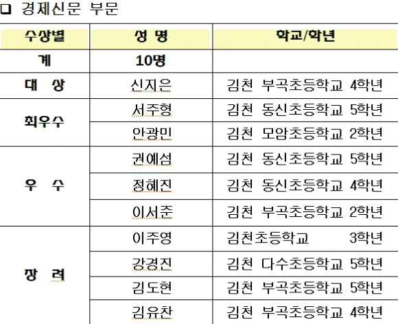 대상 부곡초4 신지은(경제신문), 동신초1 서준경(독서신문)