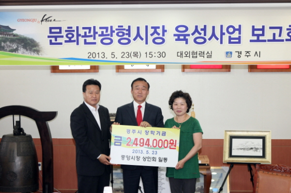 지난 5월 23일 중앙시장 상인회(회장 정동식)는 관내 학생들에게 조그만 도움이라도 되길 바라면서 중앙시장 상인회 회원들이 푼푼이 모은 장학금 2백4십9만4천원을 최양식 경주시장에게 전달했다.