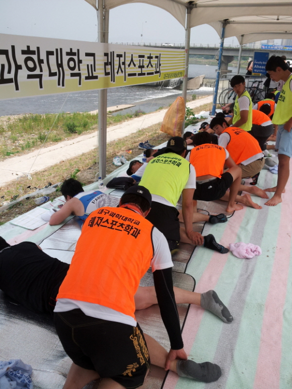 대구과학대학교 레저스포츠과 스포츠재활팀이 26일 무태교에서 열린 제 10회 대구시장배 전구 트라이애슬론대회에 엘리트 선수와 동호인 선수들을 위해 스포츠 마사지 봉사활동을 했다.