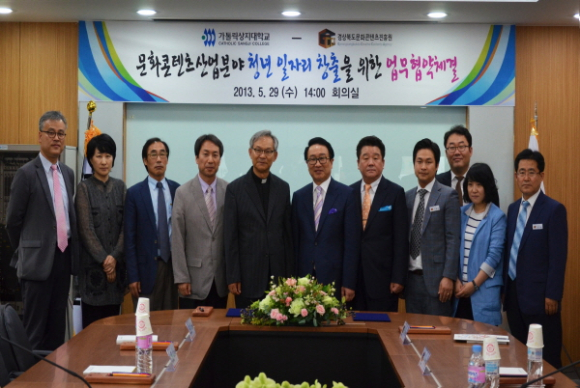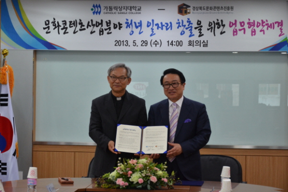 경상북도문화콘텐츠진흥원(이사장 김관용)은 29일(수) 오후 2시 경상북도문화콘텐츠진흥원 회의실에서 가톨릭상지대학교(총장 정일)와 「지역 문화콘 텐츠산업분야 일자리 창출과 창조기업 육성」에 관한 업무협약(MOU)을 체결했다.