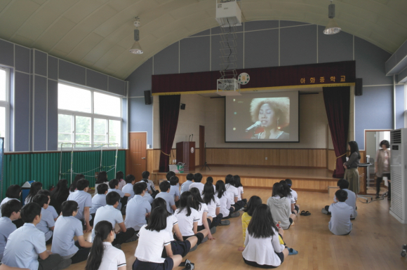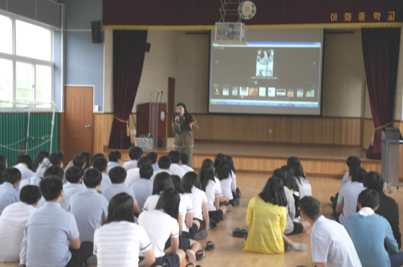 |  | | | ⓒ GBN 경북방송 | | 아화중학교(교장 김동인)는 28일과 29일 양일간 정규 수업이 시작되기 전의 아침 시간을 활용해 전교생(64명) 대상 생명존중교육을 실시했다. 사실 요즈음 절대 해서는 안되는 선택을 하는 일부 학생들로 업무담당교사와 관리자에 대한 관련 연수가 실시되고, 전체 학생, 교사 및 학부모를 대상으로 연수를 실시해야하는 이유뿐만 아니라, 소중한 우리의 아이들을 위해서 꼭 필요한 내용이기 때문에 여러 가지 해야 할 많은 일 중에서도 으뜸으로 우선순위를 정해서 실시하게 되었다. 첫째 날은 Britains Got Talent의 수잔 보일의 오디션 장면을 시작으로 학생들의 관심을 집중하면서 주변인, 경계인 등으로 자아정체감이 부족한 학생들에게 나는 누구인가? 질문을 던지고, 장애인 발레리나 남녀 두 명의 유투브 동영상을 보여주면서 나에게 꿈은 있는지, 그 꿈은 무엇인지?의 질문과 답을 나누면서 오체불만족의 오토타케의 사진을 보여주고, 나는 누구이며 내 꿈은 무엇인지를 생각하게 만들었다.