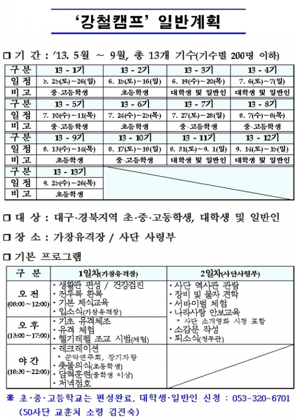 육군 제50보병사단은 5월 25일부터 9월 26일까지 1박 2일 과정으로 13개 기수를 대상으로 가창유격장, 사단 사령부 등에서 대구‧경북지역 학생, 단체, 일반인을 대상으로 병영체험‧안보교육 등 지역민과 함께하는 ‘13년 강철캠프’를 운영한다.